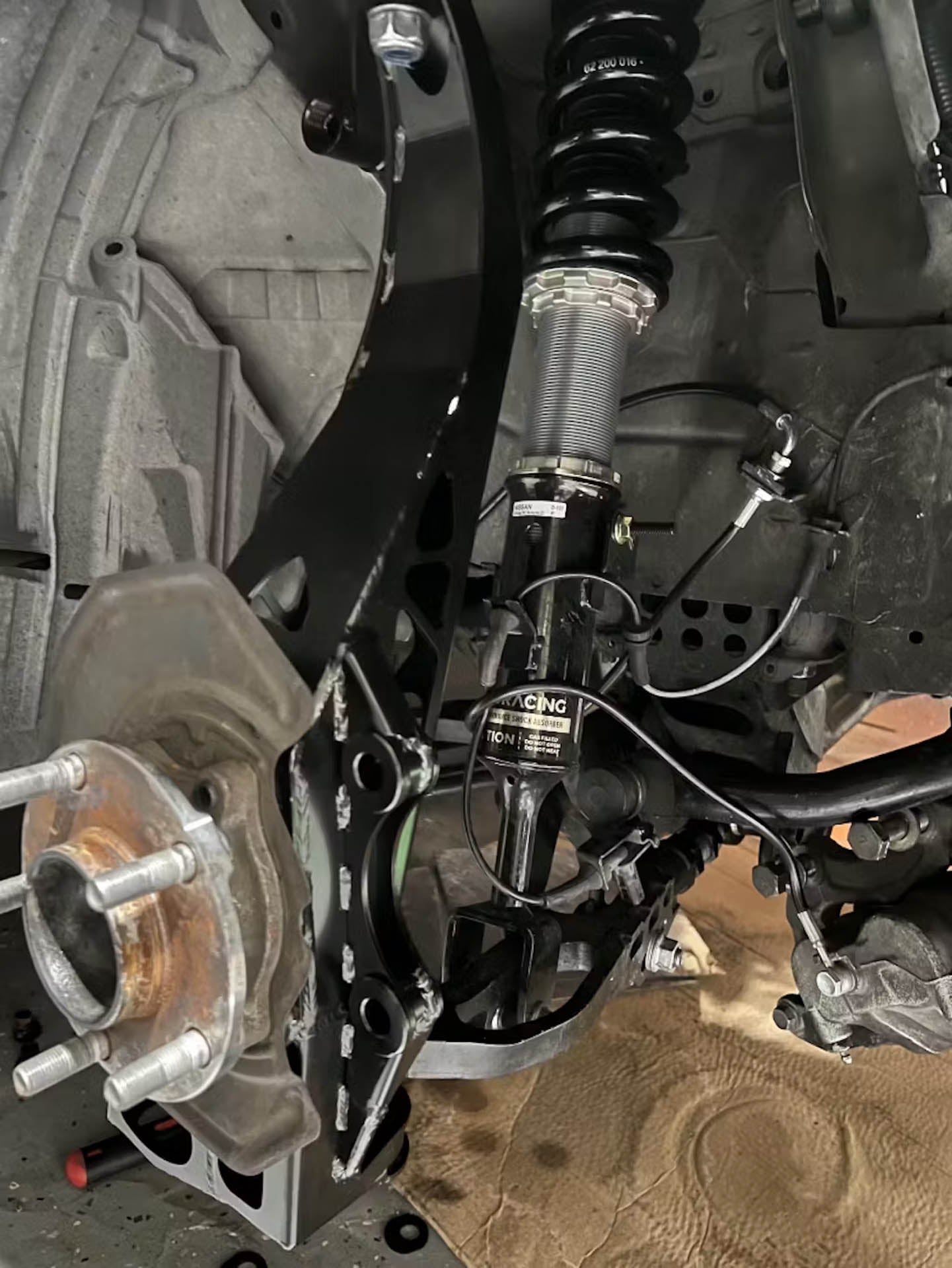 The 350z/V35's have a HUGE swaybar up front which is not ideal. Some customers choose to remove this which certainly helps with clearance. From our test vehicles we found low offsets (near 0 or even negative) were best for fitment without the use of extended FLCA's. The swaybar being the main issue.
